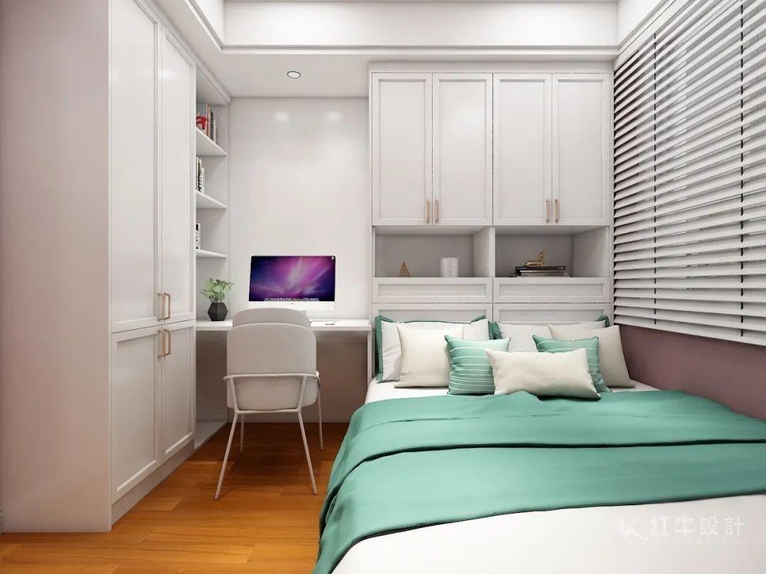 主臥相對進深比較長,可以適當(dāng)分割成兩個空間,拿出一部分設(shè)計成半開放式儲物間,增加衣物收納空間,又避免主臥衛(wèi)生間的濁氣直接對著床。