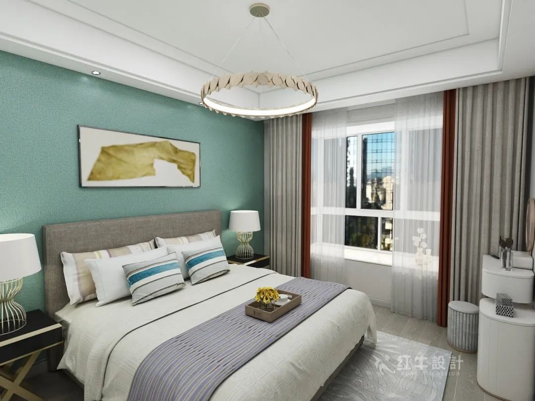 臥室背景墻用蒂芙尼藍(lán)做跳色,帶給臥室與浪漫與溫馨的情調(diào)。窗簾灰色與彩色的豎拼,使得室內(nèi)色彩更加豐富。