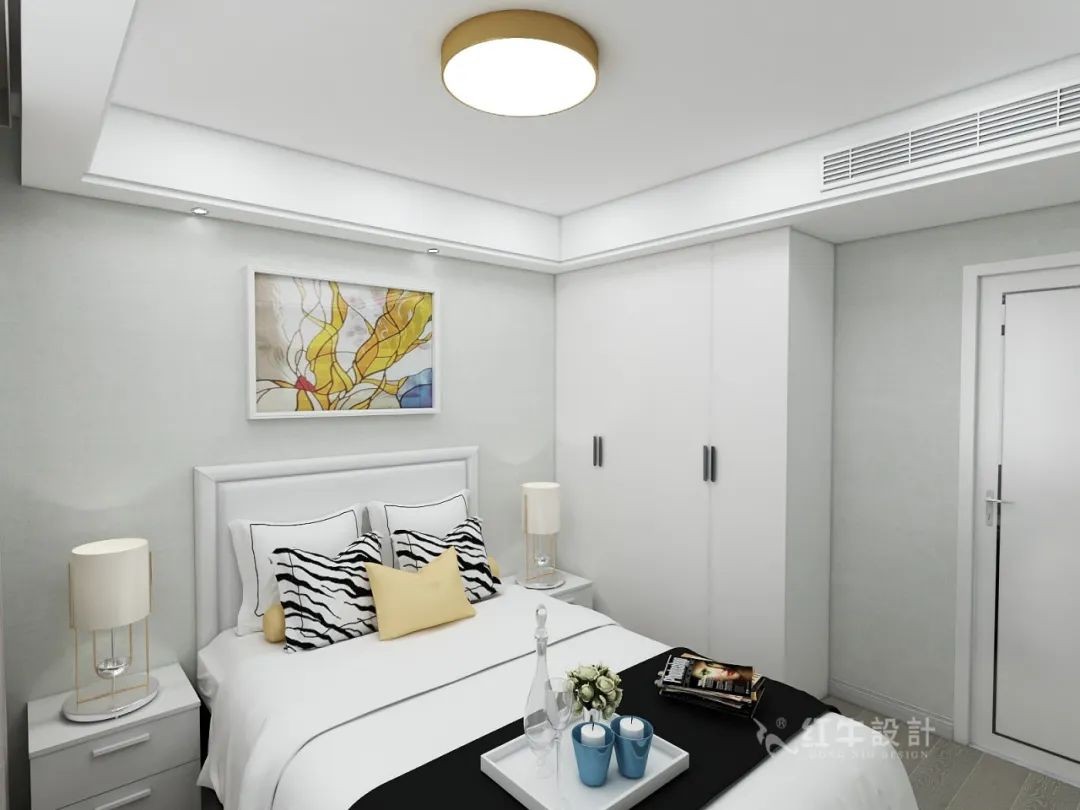次臥的門開在電視背景墻上,可以通過隱形門與護(hù)墻板對稱的做法,讓電視背景墻變得更完整,臥室的隱私性也更好。