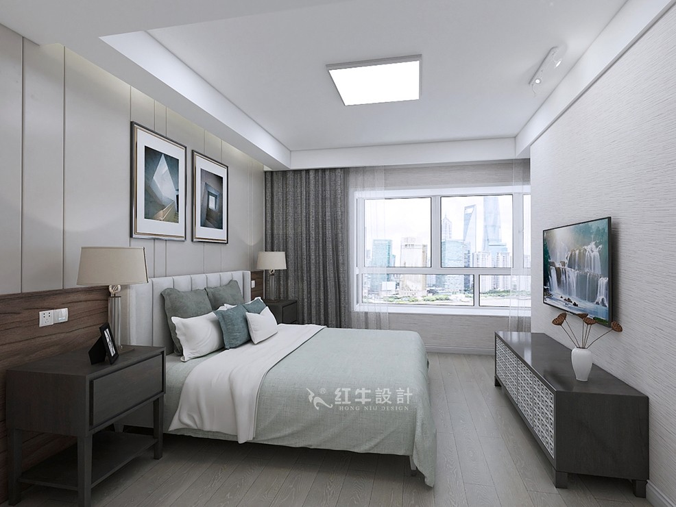 主臥室光線充足,180度全景大飄窗,衣帽間的設(shè)計,不單要滿足客戶的儲藏空間,還要有梳妝臺的功能。其它整體空間基本合理,以通透性、實用性、舒適性為主要設(shè)計思路。客戶喜歡現(xiàn)代風(fēng)格,但是不喜歡太單調(diào)的東西,定位后現(xiàn)代的風(fēng)格,客廳背景有一個到次臥室的門,設(shè)計成了隱形門,電視背景墻形成了一個整體,兩邊是框架線條加上硬包,中間鑲嵌銅條,節(jié)約大氣。