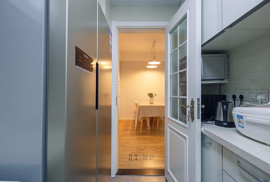 2.由于廚房的開間比較小,只夠做一個L型的柜子,再加上要放雙門冰箱,廚柜操作臺面特別小,所以把衛(wèi)生間和廚房的中間墻體拆掉,縮小的衛(wèi)生間的開間,擴大了廚房的空間,增出了很多臺面。