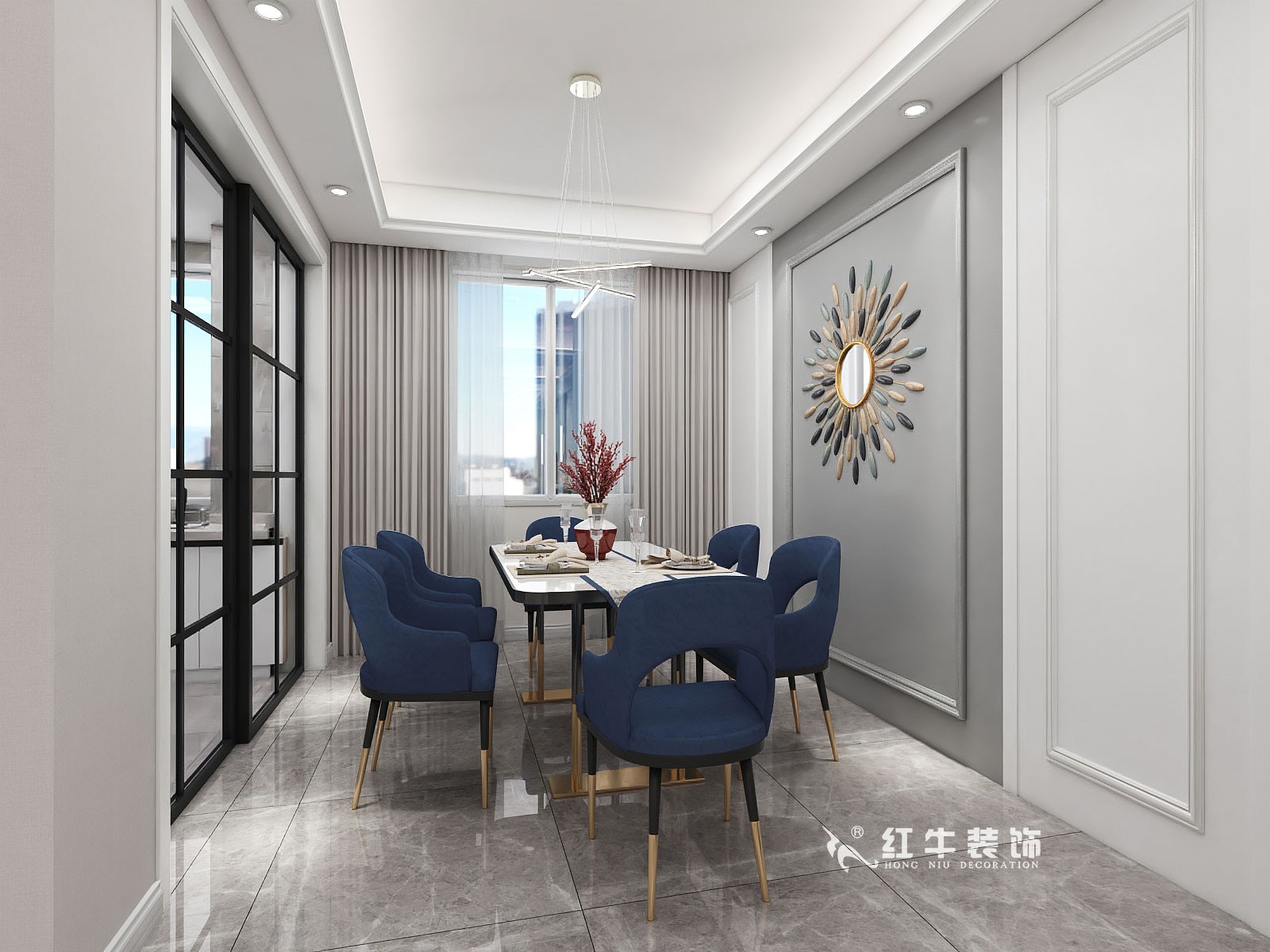 深藍色的餐椅特別吸晴,與大理石餐桌相結(jié)合,給人一種優(yōu)雅輕奢的感覺。墻上包含鏡子的裝飾很有特色,還能增加空間層次感。