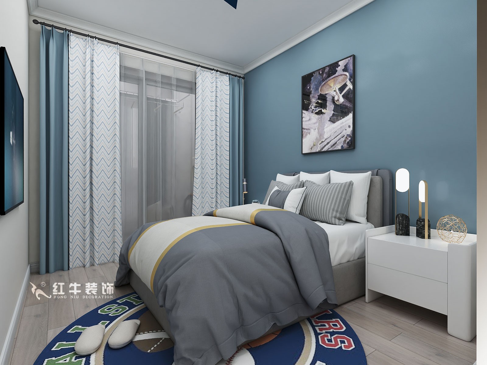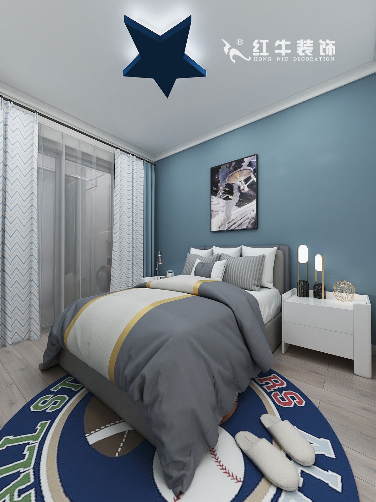 藍色系的背景墻,洋溢著清新與活力。此外,圓形的地毯、雙色拼接的窗簾、五角星形狀的吸頂燈,都包含了深淺不一的藍色,匯聚一堂,打造出清爽自然的臥室空間。