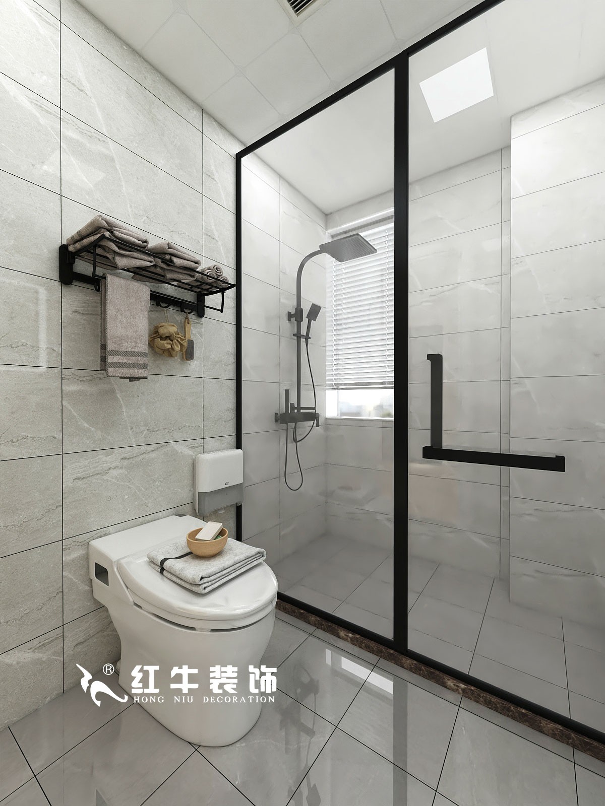 黑色邊框淋浴房加黑色的五金件,與墻地面形成對比,整體比較耐看。同樣材質(zhì)的置物架很好地利用了馬桶上方的位置,平時可以用來放置浴巾、懸掛毛巾。