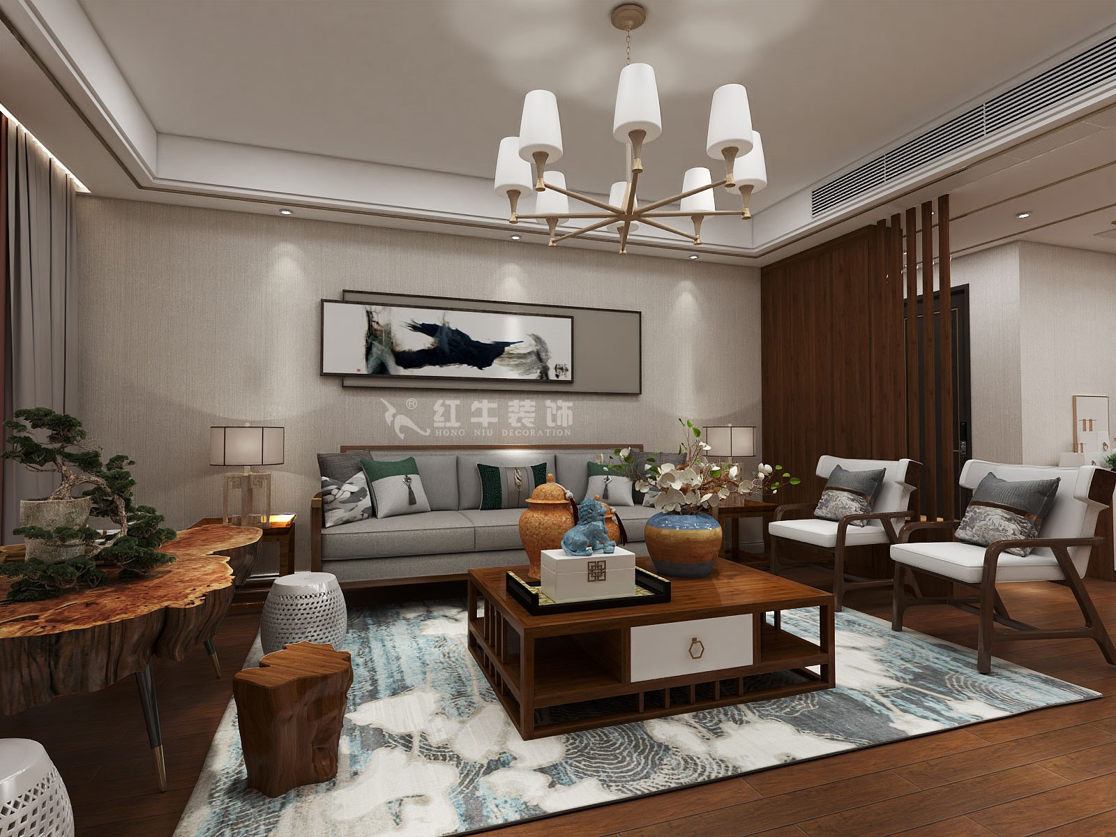 本案定義為新中式風(fēng)格,家具以新中式元素,增加空間層次感和質(zhì)感。