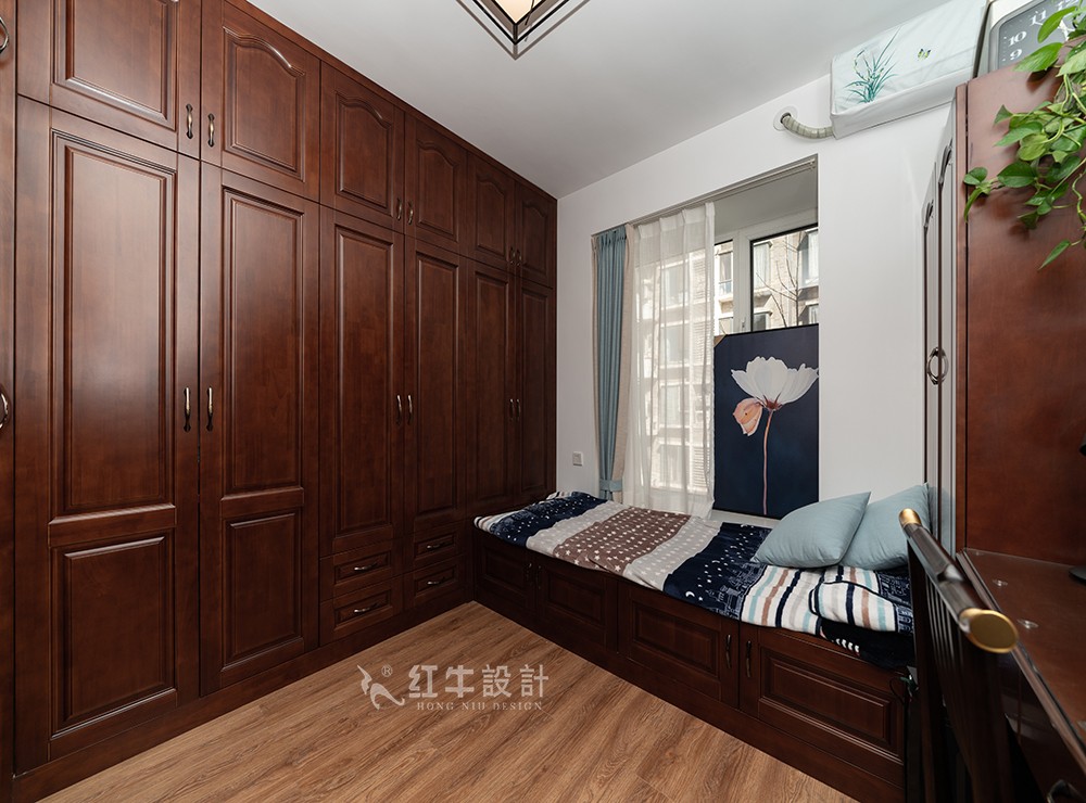 本案以深色實(shí)木家具配淺色墻地面,整體空間張弛有度,流暢自然。