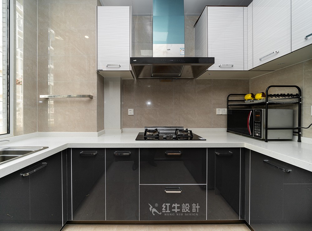 廚房頂部是白色吊柜,底部是黑色亮面櫥柜,而位于中間的墻壁顏色則介于這兩者之間,作為上下的調(diào)和與過(guò)度,這樣上輕下重的顏色設(shè)計(jì),顯得非常和諧。