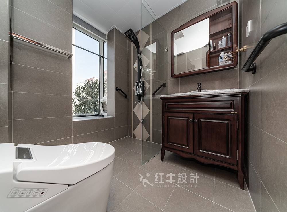 主臥的淋浴部分選擇了半隔斷設(shè)計(jì),只要遮擋住花灑,保留一平米的遮擋位置,同樣能阻擋水漬外濺,這樣的設(shè)計(jì)簡(jiǎn)潔大方,使得衛(wèi)生間看起來(lái)更寬敞通透。