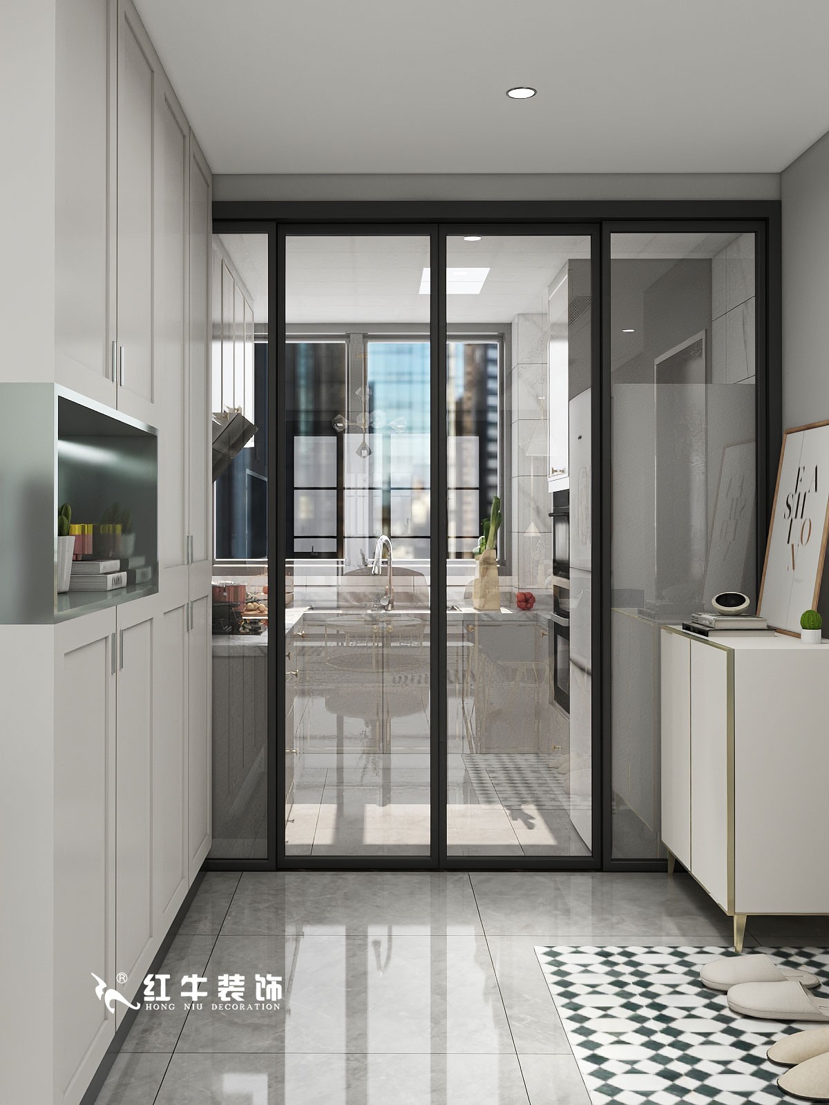 廚房選用了玻璃推門,既能保障采光,也能防止油煙外泄,還不會(huì)給人帶來的隔斷感。廚房?jī)?nèi)部是嵌入式設(shè)計(jì),把家電嵌入到櫥柜中,家電的排列組合會(huì)更加科學(xué),整個(gè)空間看起來非常清爽。