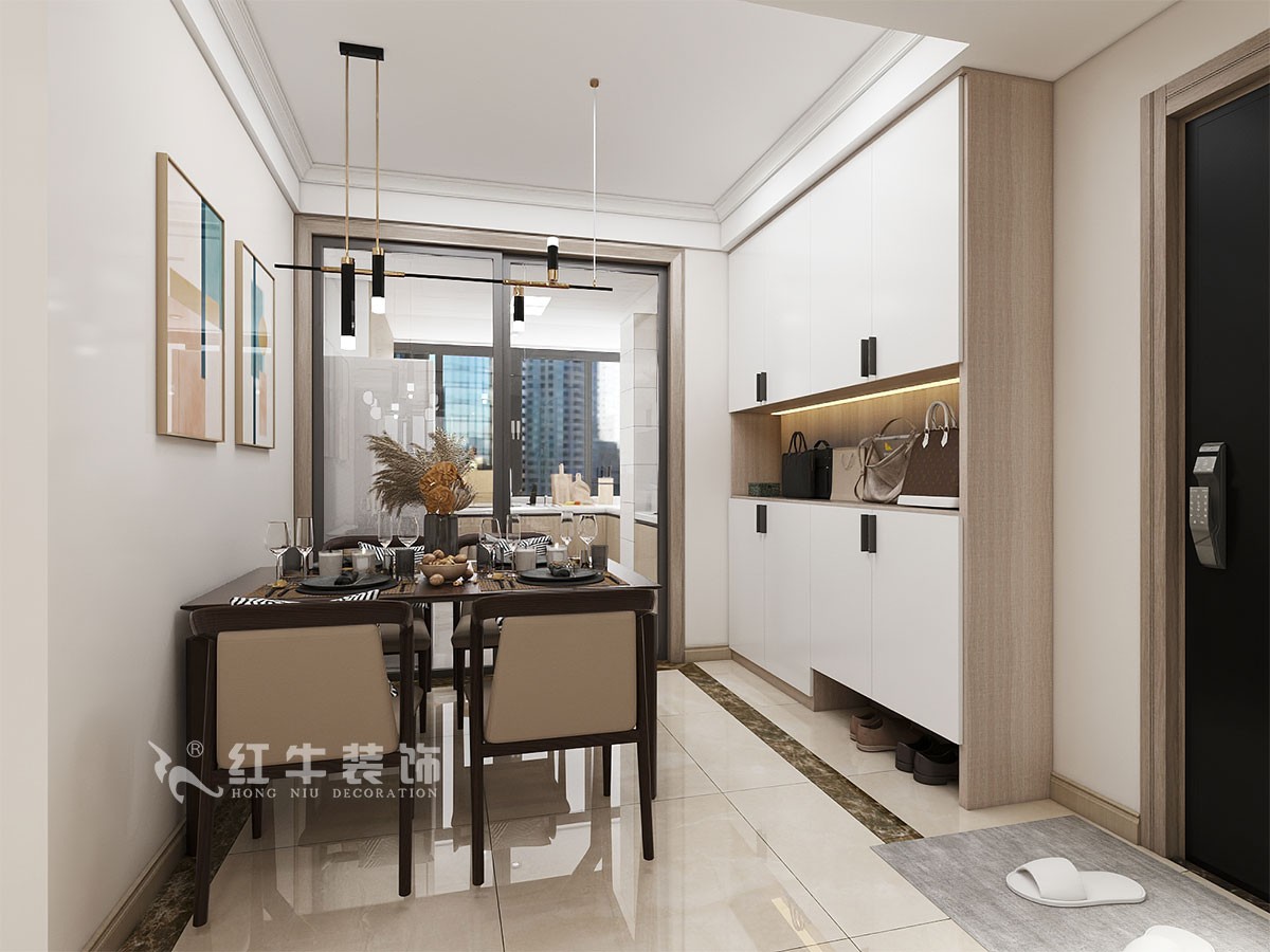 在整個房屋平面布置上餐廳區(qū)域做了個大的改動,將原來的北陽臺的面積規(guī)劃到廚房里面,從原來的廚房面積里讓一些空間給餐廳使用,保證一家人在餐廳正常用餐情況下能有足夠的空間,還餐廳一片整潔;整體裝修的硬裝部分以流行暖色為主色,形成了自然而極致的家居風(fēng)格。