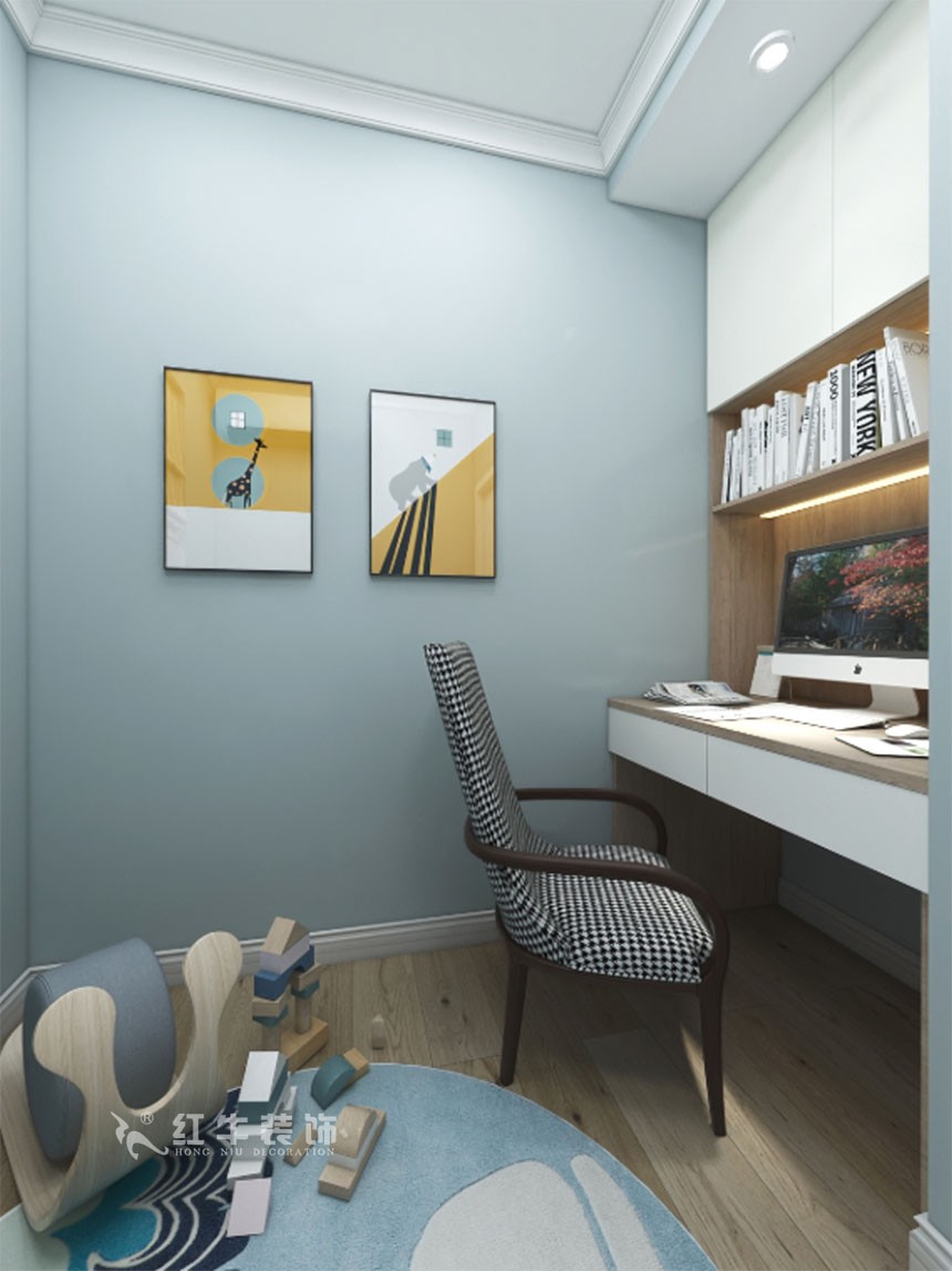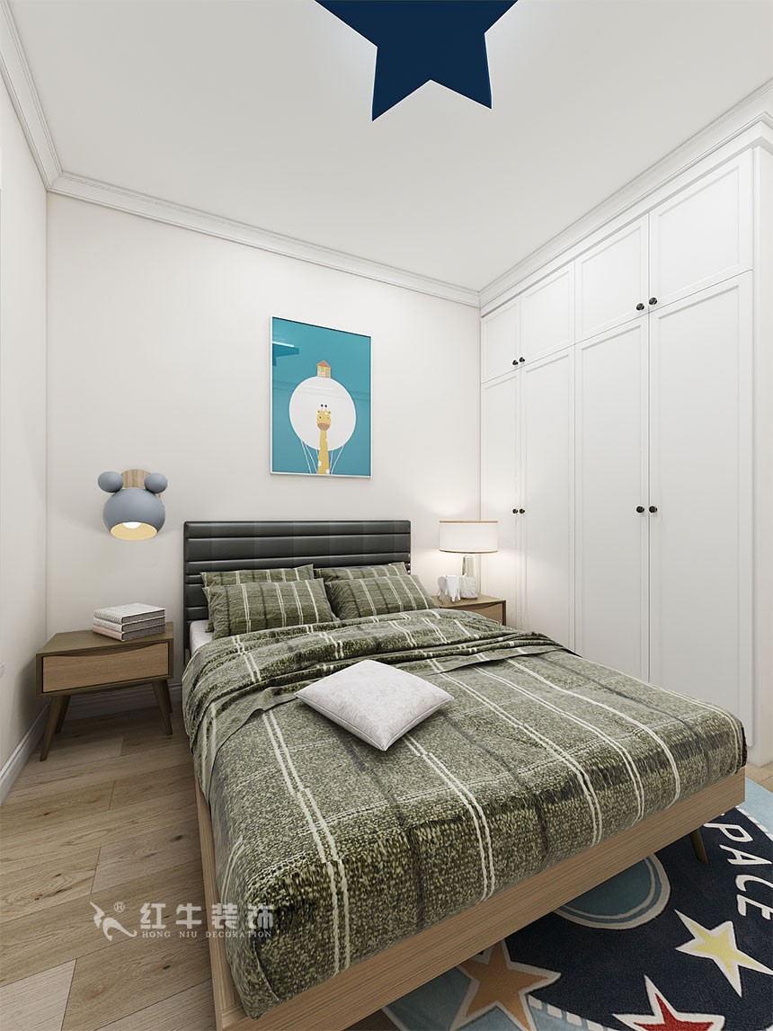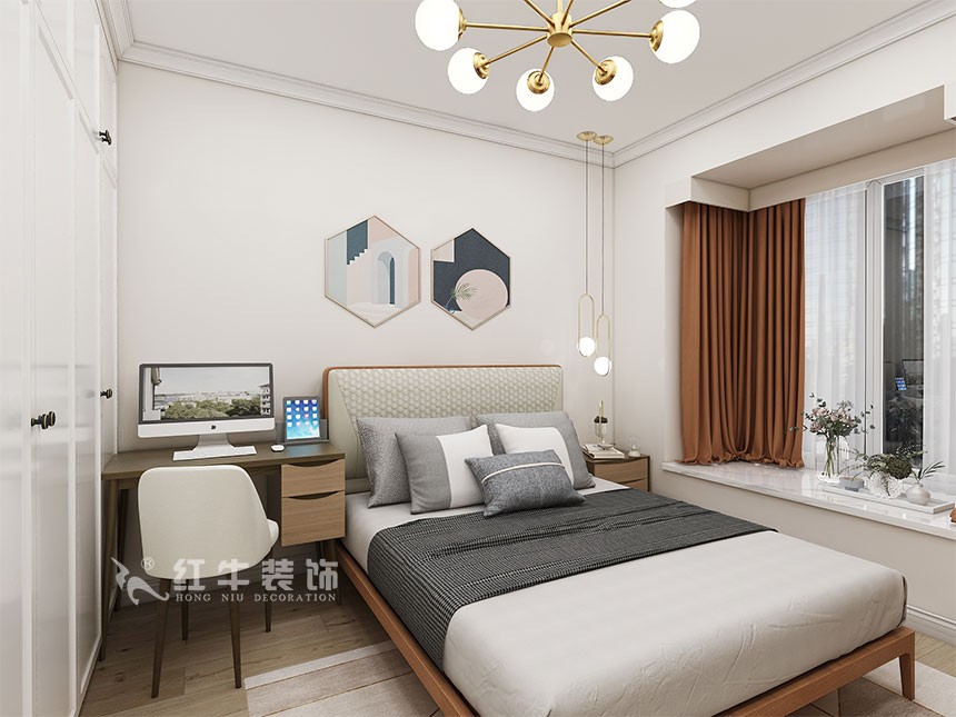 整體風(fēng)格簡約,白色和木紋色營造出溫馨的生活氣息,次臥室設(shè)計(jì)了組合柜,既有學(xué)習(xí)的區(qū)域同時(shí)也兼顧了休閑空間。