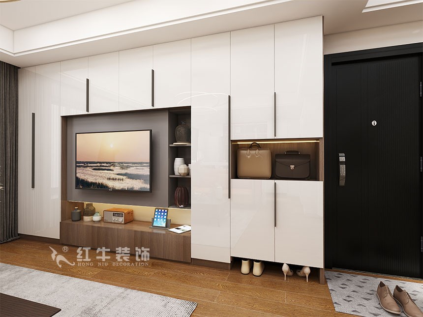 電視背景墻選用柜體做造型,簡(jiǎn)潔大方,玄關(guān)也能更好地整合進(jìn)去,避免背景墻太短顯得小氣。