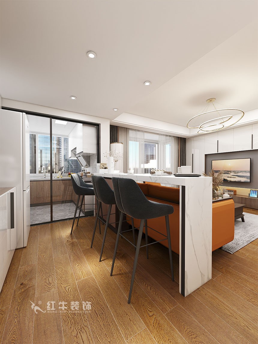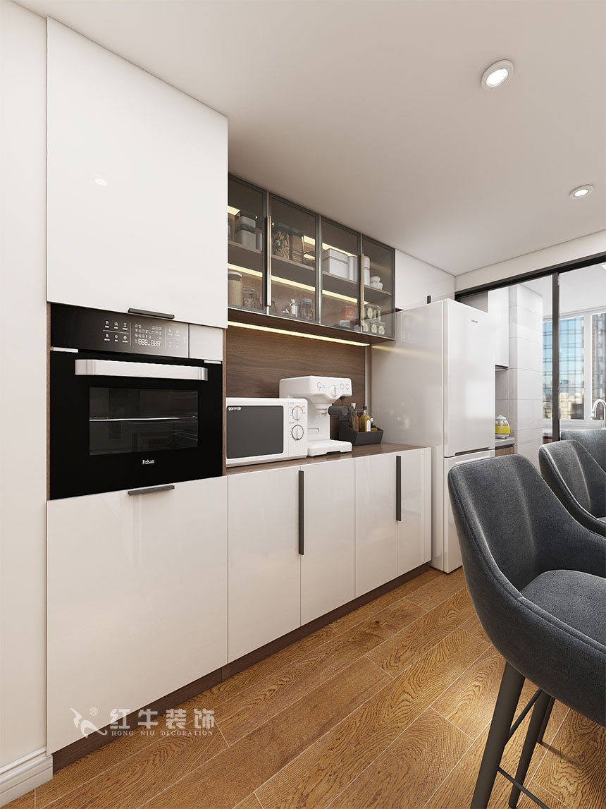 廚房區(qū)域進(jìn)行大改,中西廚兼具,西廚的吧臺(tái)作為沙發(fā)墻與客廳形成一個(gè)整體。