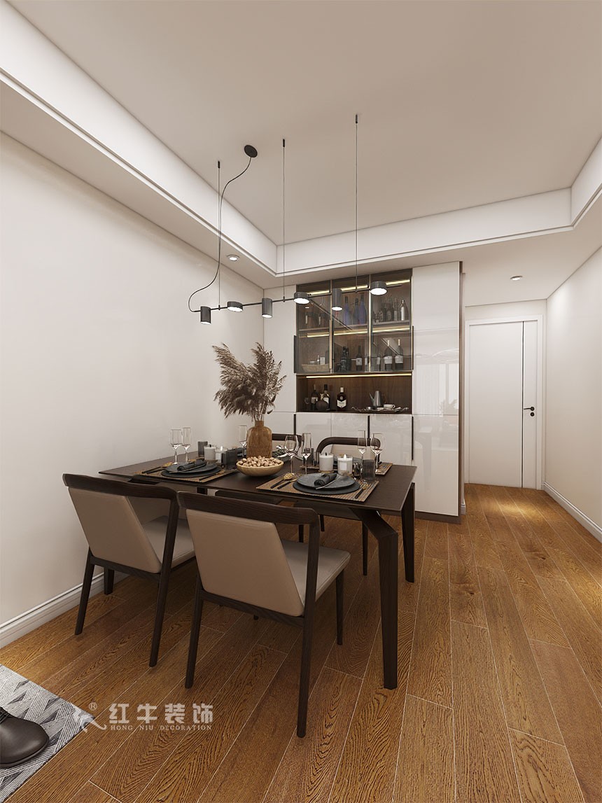 餐邊柜上安裝了透明的玻璃柜門,像是給內(nèi)部的裝飾品加上了一層濾鏡,顯得非常精致美觀,增加了餐廳的情調(diào)。