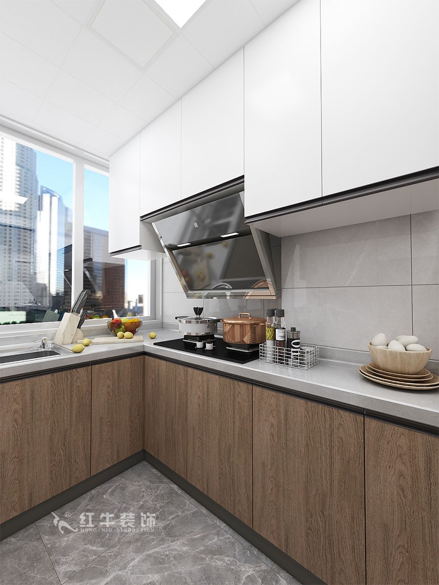接近正方形的廚房空間里,設(shè)計(jì)了U型櫥柜,保證充足的活動(dòng)空間。窗戶下方做水槽,水槽和灶臺(tái)的中間作為操作臺(tái),洗切炒的動(dòng)線非常流暢。