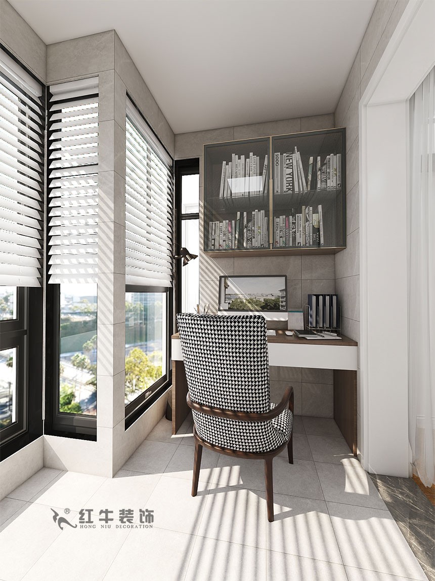 次臥的陽(yáng)臺(tái)被打造成書房,搭配百葉窗,可以很好地調(diào)節(jié)光線,創(chuàng)造出舒適的學(xué)習(xí)環(huán)境。