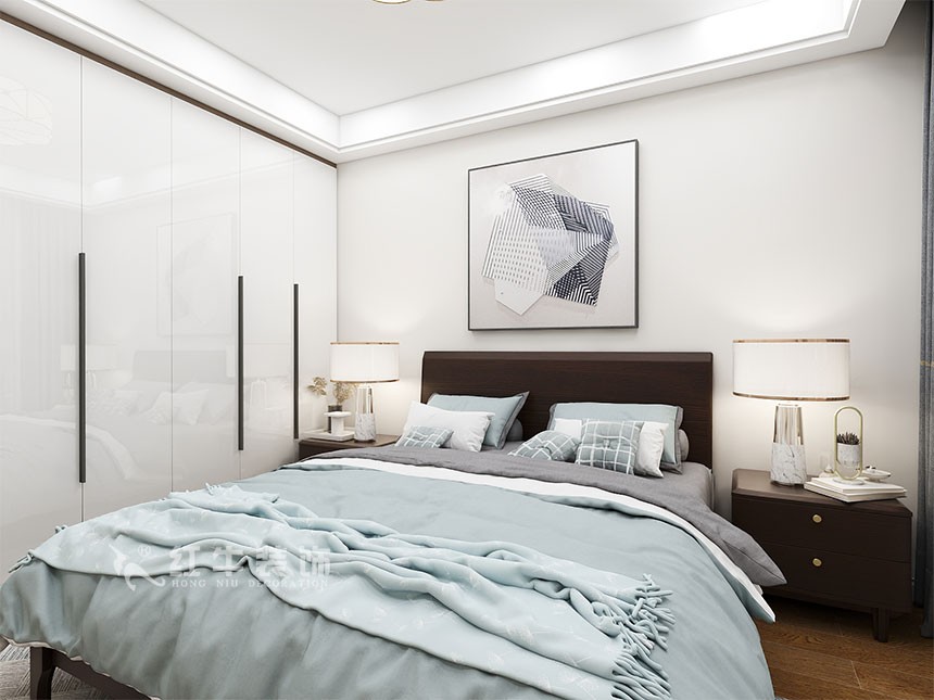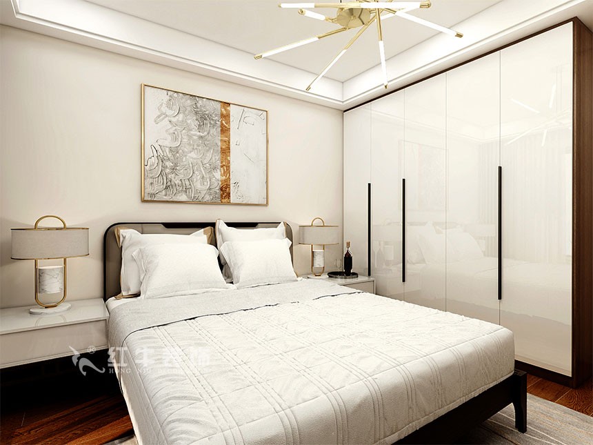 主臥布置方面遵循了對(duì)稱的原則,為房屋主人營(yíng)造一個(gè)平衡的氛圍,處于臥室中央的大床看起來(lái)就非常柔軟舒適,有助于睡眠。