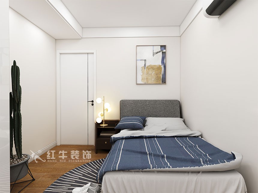 面積緊湊的小臥室作為客房使用,床靠墻擺放,留出足夠的通道和活動(dòng)空間,然后在床頭多余的位置塞下一個(gè)床頭柜,動(dòng)線比較合理。