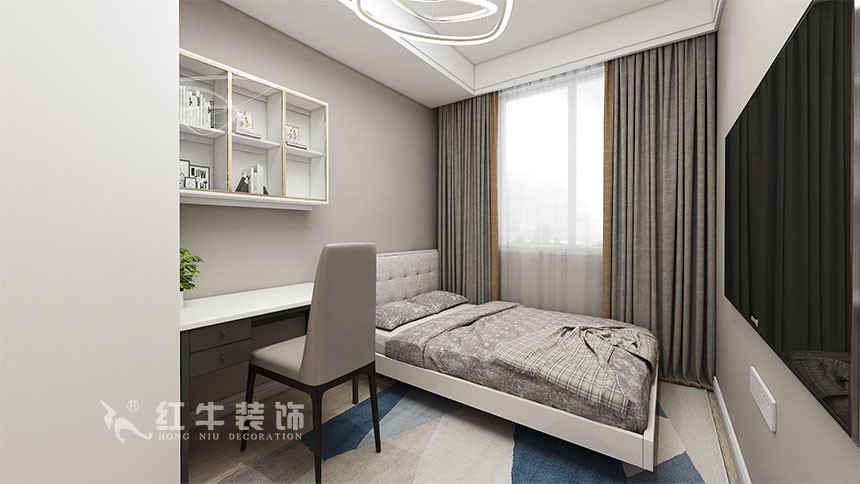 整體風格簡約,白色和淺灰色營造出溫馨的生活氣息,次臥室設(shè)計了組合柜,既有學習的區(qū)域同時也兼顧了休閑空間。