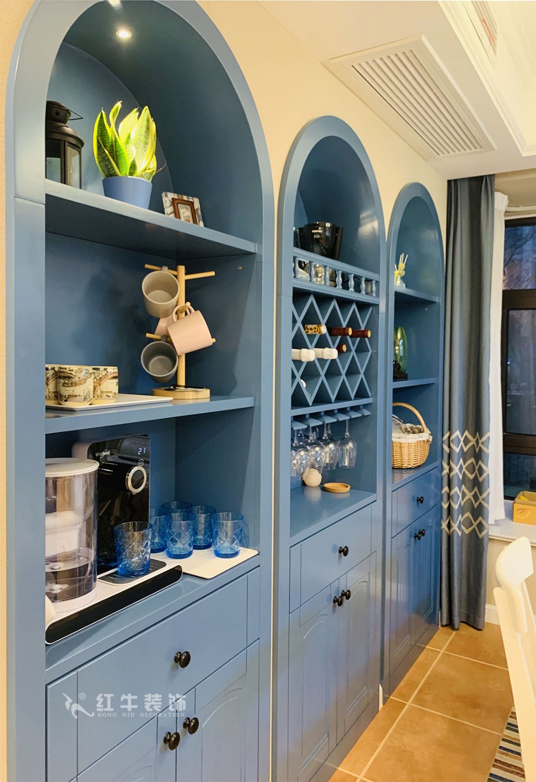 以白色為主色調(diào)的餐廳,顯得尤為純凈雅致,最吸睛的就是藍(lán)色的內(nèi)嵌的置物架,頂部的拱形設(shè)計(jì)就是地中海風(fēng)格的典型特征。