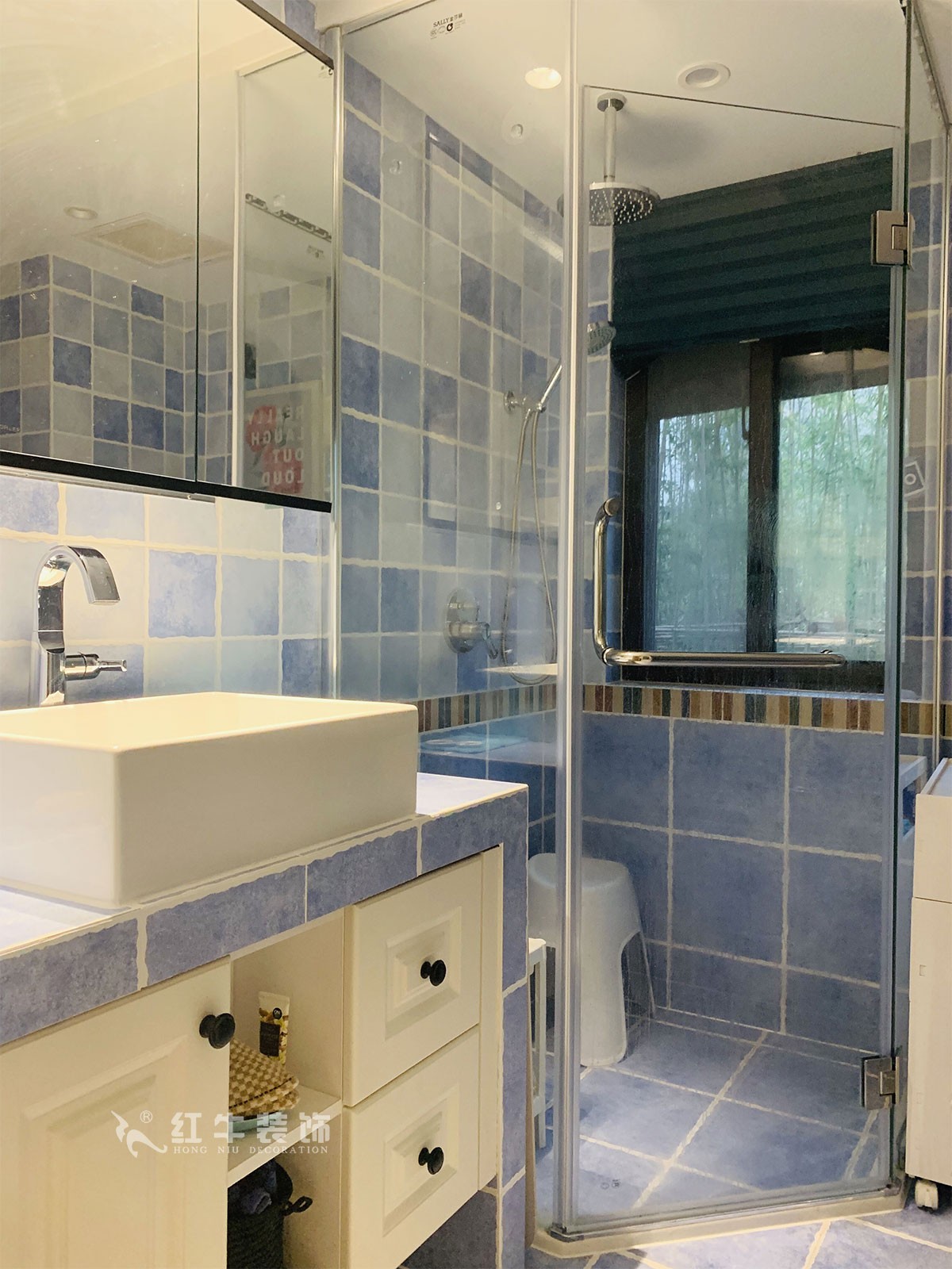 這是主臥的衛(wèi)生間,不同的藍(lán)色、白色瓷磚拼貼在一起,在井然有序中又體現(xiàn)出生動(dòng)和變化,看著感覺(jué)心情舒暢。