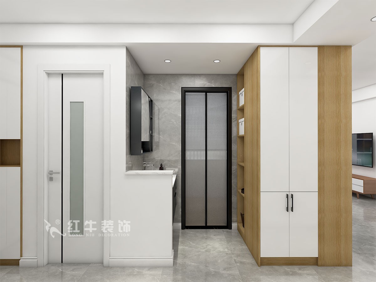 本案設計業(yè)主小夫妻,帶小孩居住,顏色原木色加白色柜門,整體簡約明亮,給人以溫暖安心的感覺。衛(wèi)生間的結構改動,解決了干濕分離的問題。主臥門洞改方向,解決了電視背景墻狹窄的問題。