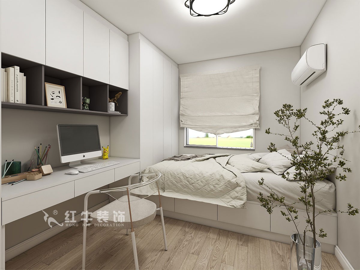 此案主要是婚房居住,在舒適度上要求比較高,臥室是整套房子中最私人也是最體現(xiàn)出溫馨休閑感的空間,在設(shè)計(jì)時體現(xiàn)出靜謐舒適的感覺,并且與其他空間明顯的區(qū)別,利用衛(wèi)生間砌墻,做干濕分離,把冰箱嵌入廚房,更好的布局。這樣舒適度更好,區(qū)域劃分明顯,動靜分離。吊頂簡潔大氣,配以輕現(xiàn)代家具,完美闡釋了簡約風(fēng)格。整體現(xiàn)代簡約風(fēng)格的設(shè)計(jì),搭配上顯眼的綠色植物讓整個空間呈現(xiàn)出一種生機(jī)勃勃的自然美。