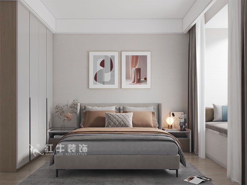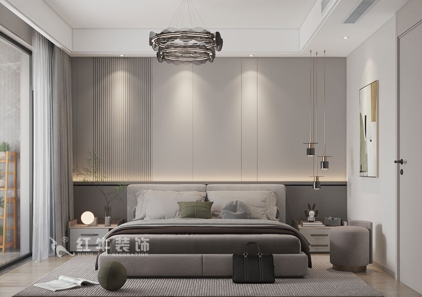 3、主臥延續(xù)了極簡(jiǎn)風(fēng),沒(méi)有過(guò)多裝飾的床頭背景和簡(jiǎn)單的吊線(xiàn)燈,整體的家具色彩搭配和諧也是用了低飽和度色和原木色的結(jié)合。